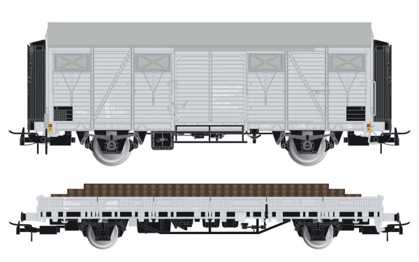H0 I FS Güterwagen ged., Set., 1x beladen, 2x, 2A, Ep.IV, hellgrau, Holzschwellen,